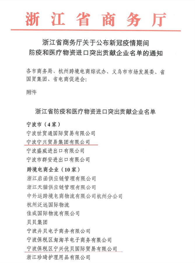 表彰!宁兴贸易集团、宁兴优贝获评省级防疫和医疗物资进口突出贡献企业