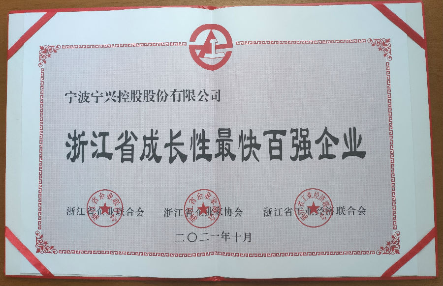 宁兴控股首次获得“浙江省成长性最快百强企业”荣誉称号。