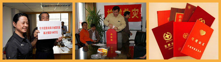 心系灾情,积极投入赈灾捐助。2008年四川汶川大地震发生,公司先后四次开展向四川地震灾区赈灾捐款救助活动,捐款金额累计近140万元。2003年抗击非典期间,宁兴控股向宁波市抗击非典一线医务人员捐款16万元;并提供红外线测温仪638只,专用口罩1000只,以及隔离服和眼罩等物品,被宁波市防非典领导小组办公室授予“抗非典物资保障奖”。当莫拉克台风、玉树地震、西南旱灾等大灾来临给受灾民众造成巨大损失时,宁兴控股都以实际行动积极投入救灾捐助活动中。