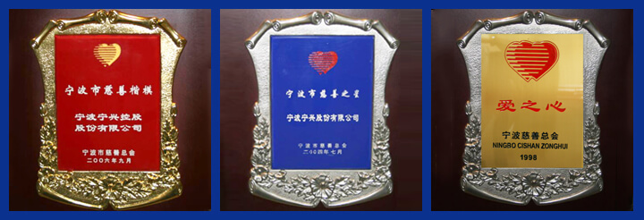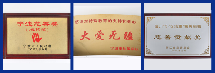 慈善荣誉公司多次被评为宁波市对外经贸企业年度大奖“社会责任奖”,宁波市慈善机构奖、慈善楷模等。