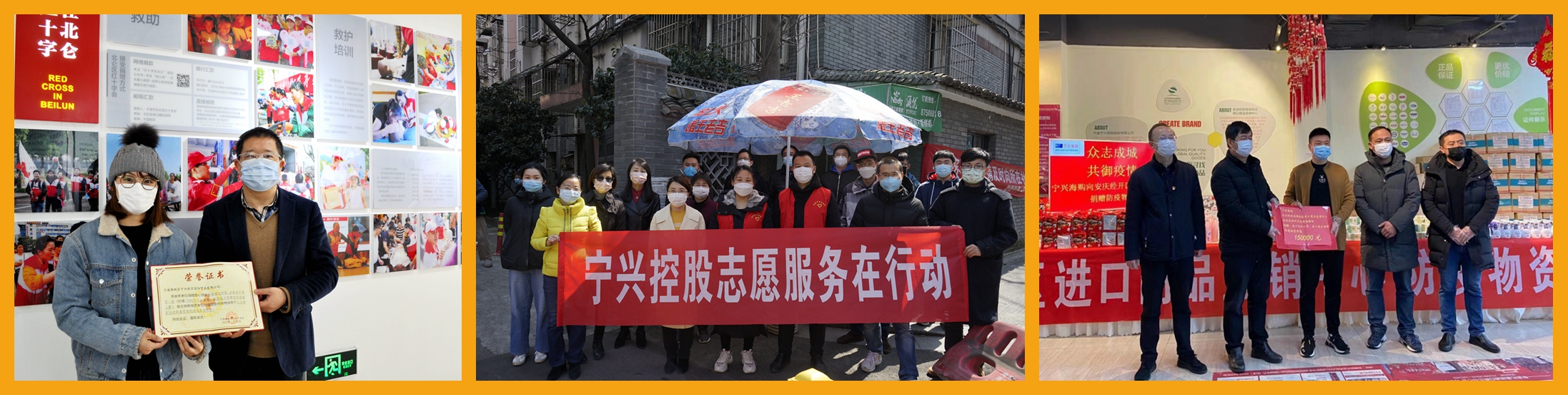 2020年积极参与新冠抗疫捐助,组织下属宁兴优贝、宁兴海鑫等公司火速筹集总价值100多万元防护和消毒用品,第一时间捐赠抗疫一线;宁兴贸易集团积极配合宁波市防控部门、市商务局做好防疫物资进口;开展“抗疫情献爱心”捐款活动,发动集团全体党员为抗疫捐款;积极参与抗疫志愿者活动,到所在社区居民小区帮助一线防疫工作,彰显企业社会责任和宁兴人风采。宁兴控股所属宁兴贸易集团、宁兴优贝获评浙江省商务厅表彰的“浙江省防疫和医疗物资进口突出贡献企业”。