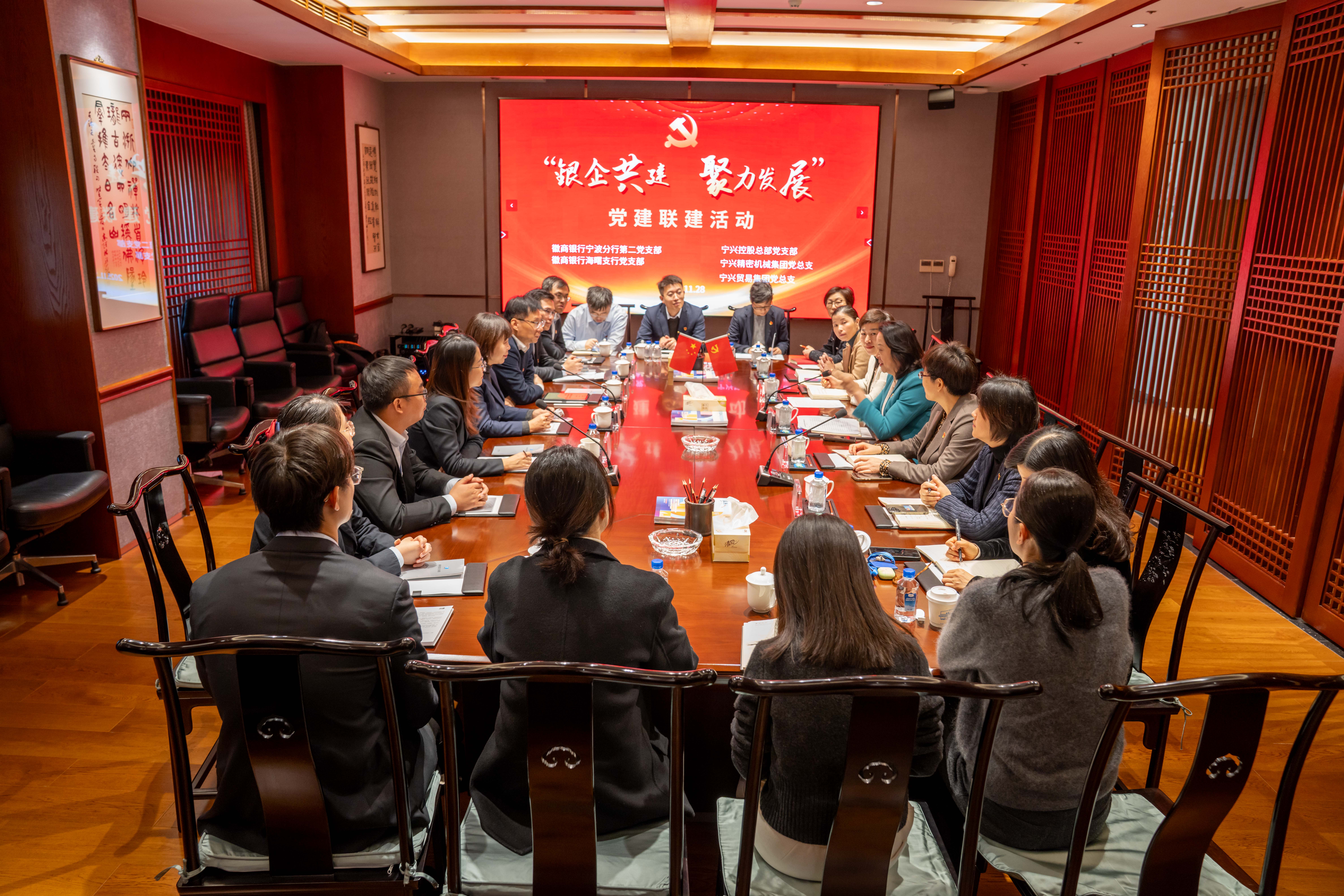 为强化党建融合,深化银企合作,11月28日上午,宁兴控股党委下属宁兴精密机械集团党总支、宁兴贸易集团党总支、宁兴控股总部支部与徽商银行宁波分行第二党支部、海曙支行党支部开展“银企共建 聚力发展”党建联建活动。徽商银行宁波分行纪委书记杨锋,分行二支部书记、资产保全部总经理俞小明,海曙支行党支部书记、行长彭燕萍,宁兴控股党委书记、副董事长高屏,纪委书记、副总裁杨晓君,党办主任章慧红以及五个支部党员代表等20多名同志参加活动。